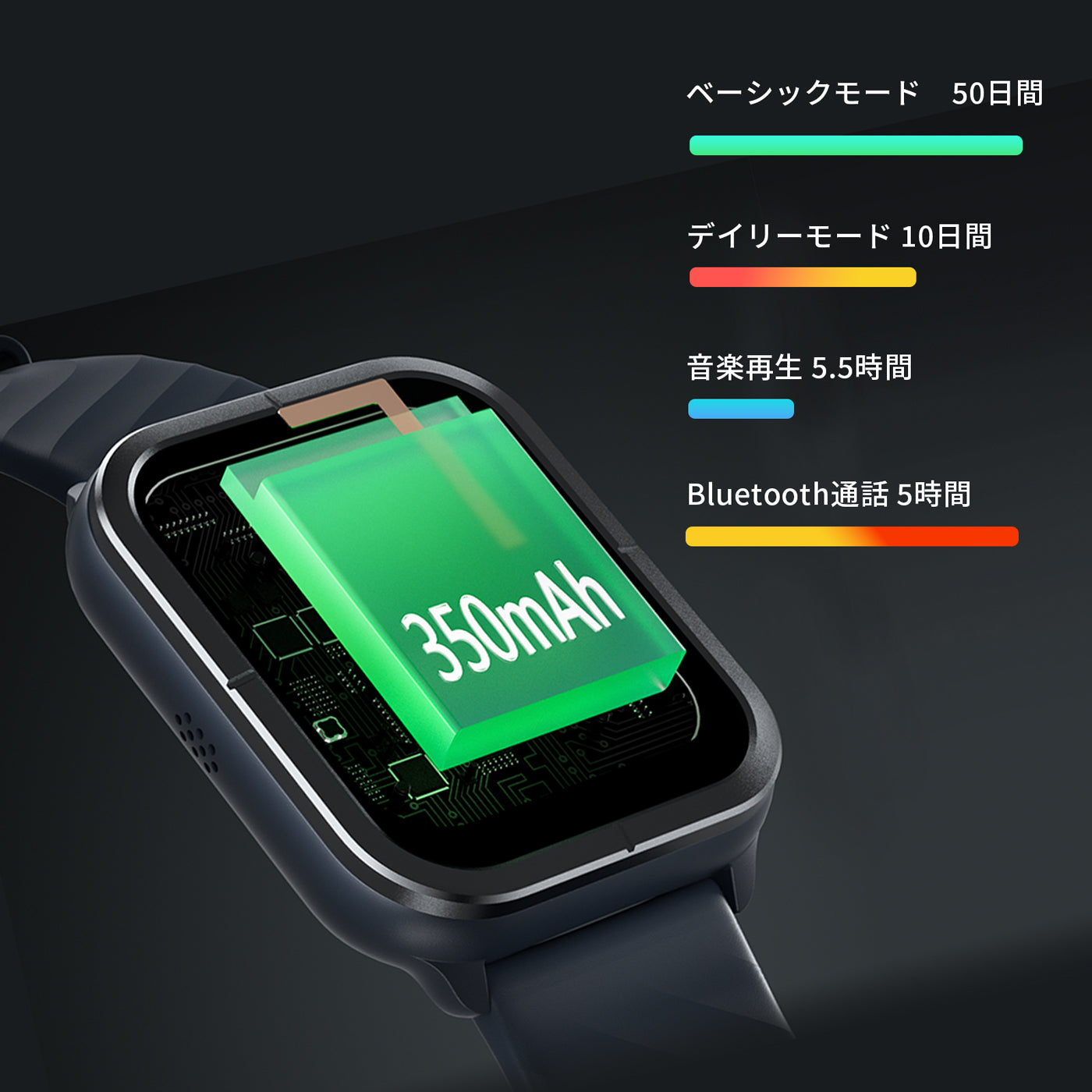 ※デイリーモード:フル充電の状態かつモバイルアプリに接続した場合。以下の機能を使用可能です:24時間心拍数の常時モニタリング、睡眠モニタリング、週に60分の運動記録、週に30分の音楽再生、週に30分の通話、1日100通のメッセージと6回の通話(5秒で切断)、手首を上げて画面を点灯して60回の時間確認、1日3回の目覚まし時計、およびその他の工場デフォルト設定。