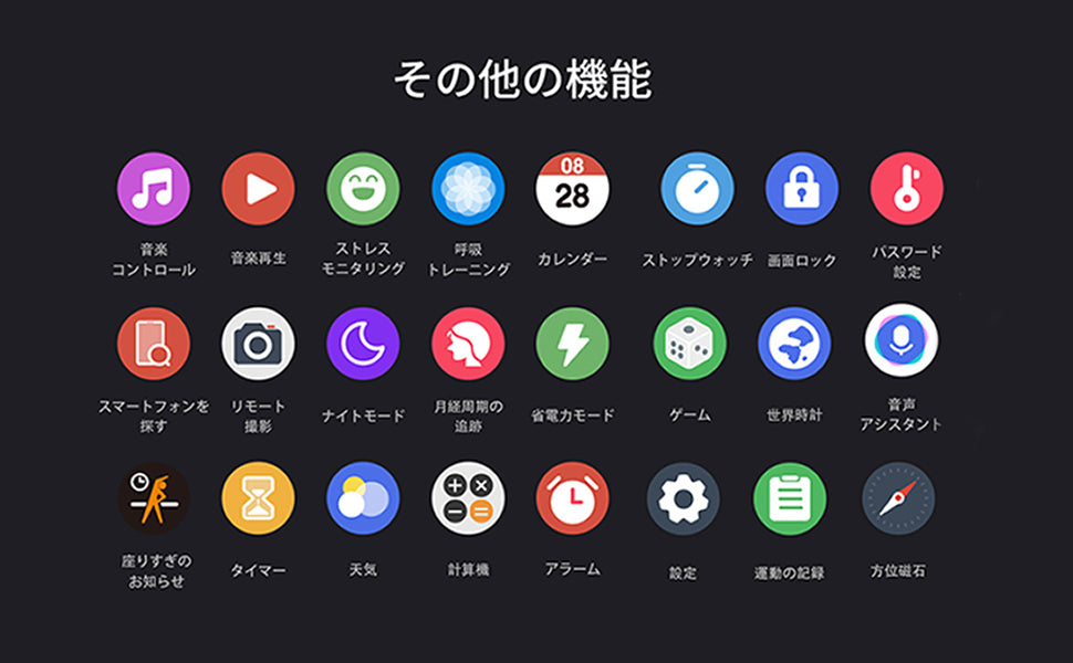 ■センサー:光学式心拍センサー、血中酸素レベル測定センサー、加速度センサー、ジャイロスコープセンサー、地磁気センサー、光センサー、気圧高度計