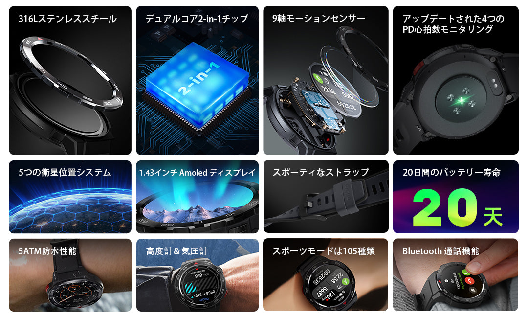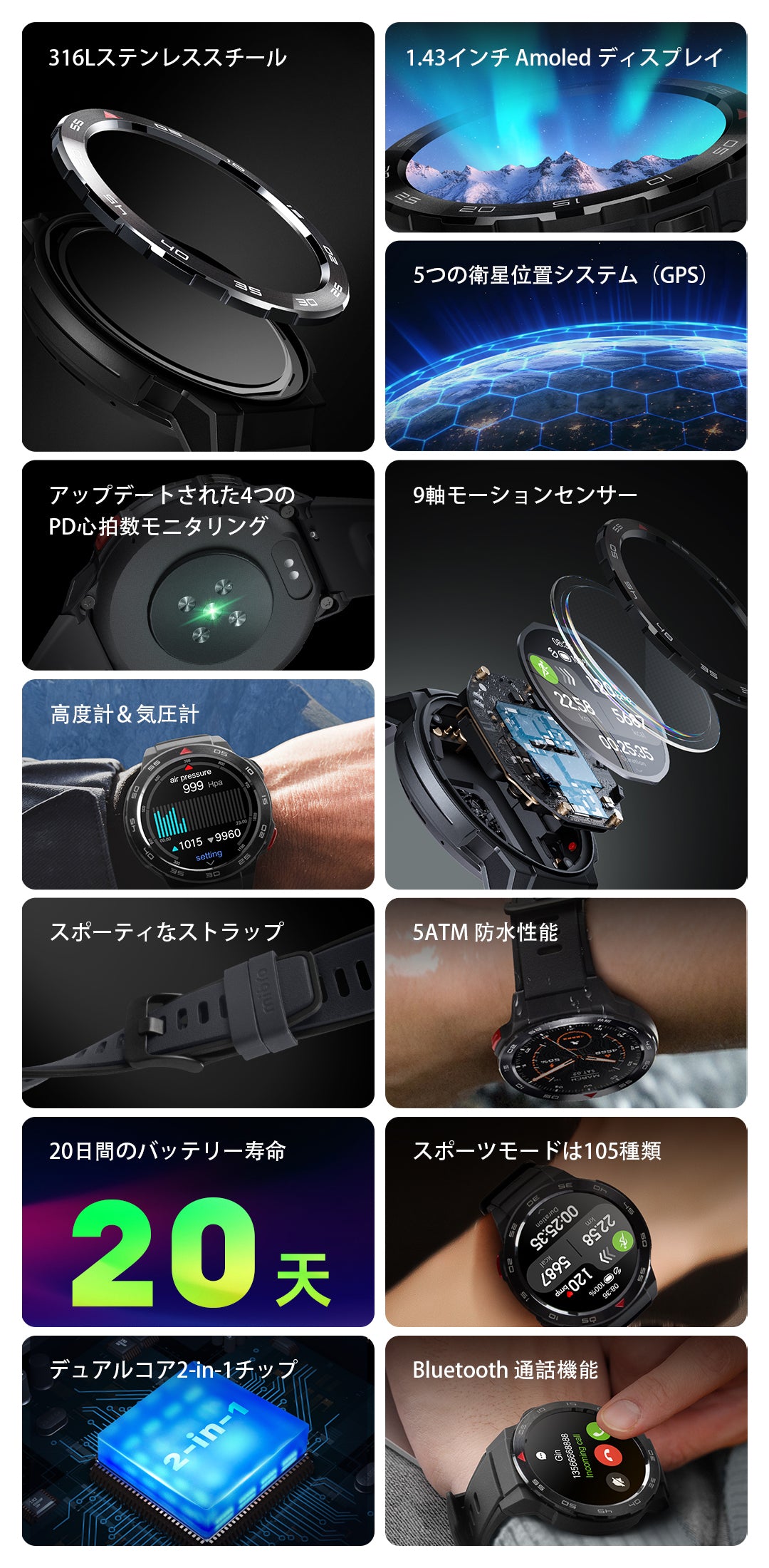 最大20日間駆動の大容量バッテリー、105種類のスポーツモード、高精度 5衛星 GPS 測位、5ATM 防水性能 を備えたスマートウォッチ。iPhone/Android 両対応、通話機能も搭載し、日常からアウトドアまで幅広く活用可能です。