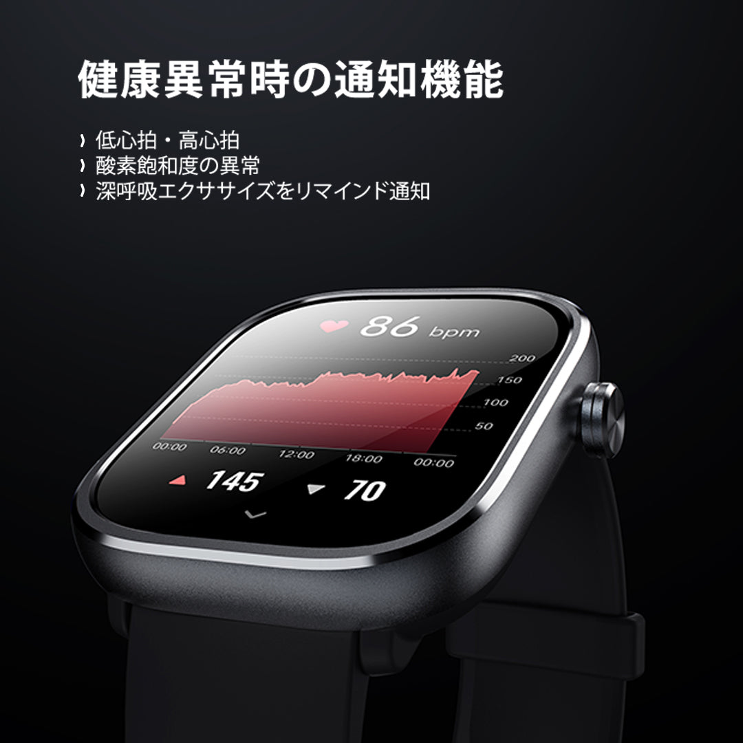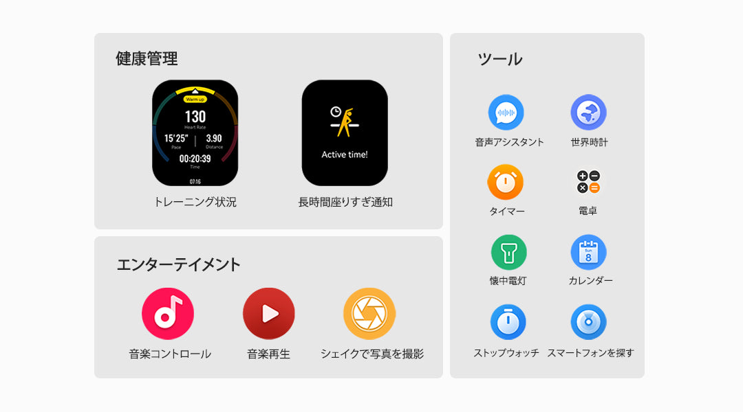■その他の機能:Bluetooth通話、音楽コントロール、ウォッチでの音楽再生、振って写真撮影、ウォッチを探す、着信通知、通話拒否、おやすみモード、アプリ通知、世界時計、アラーム設定、天気、タイマー、ストップウォッチ、画面ロックなど