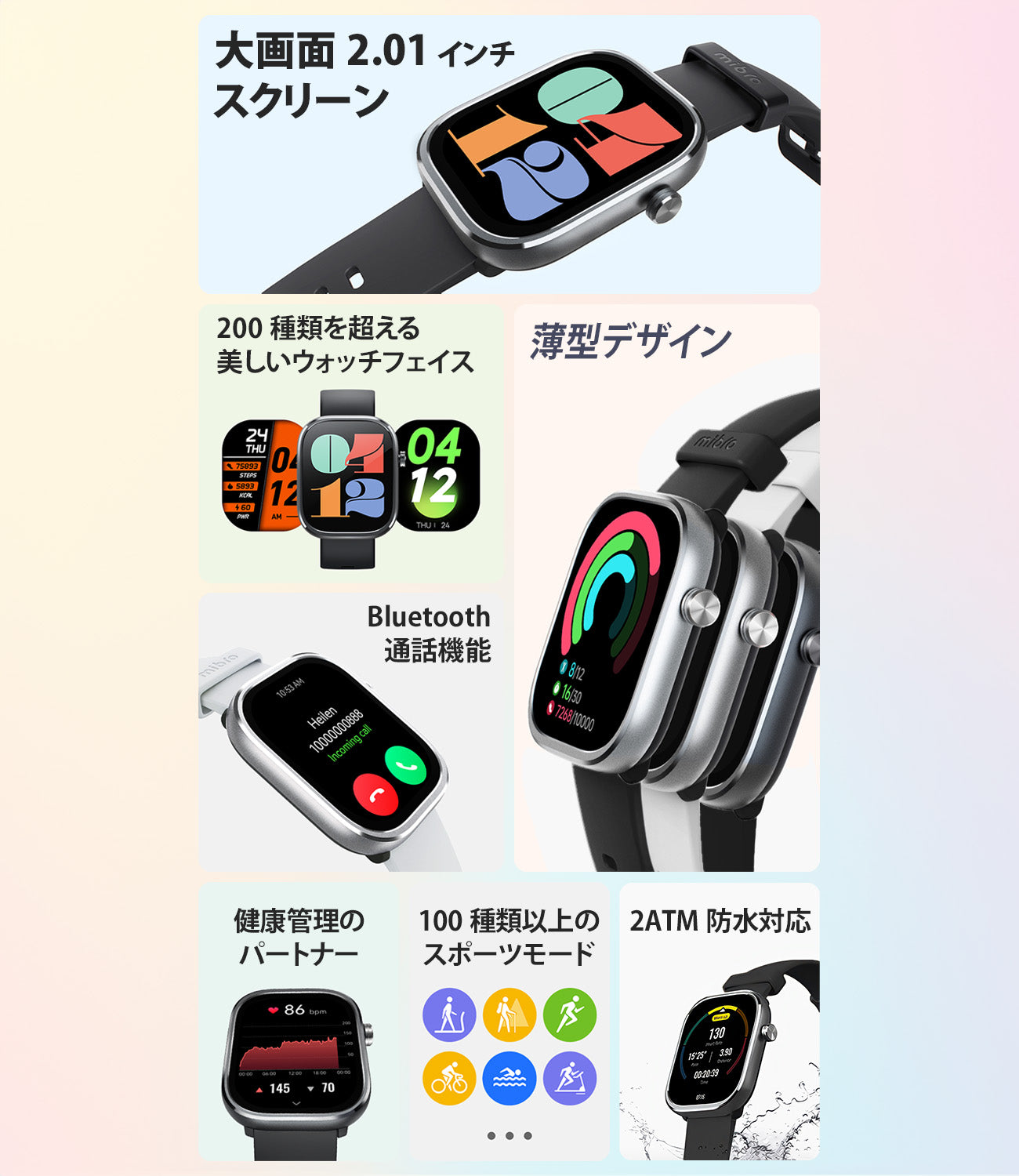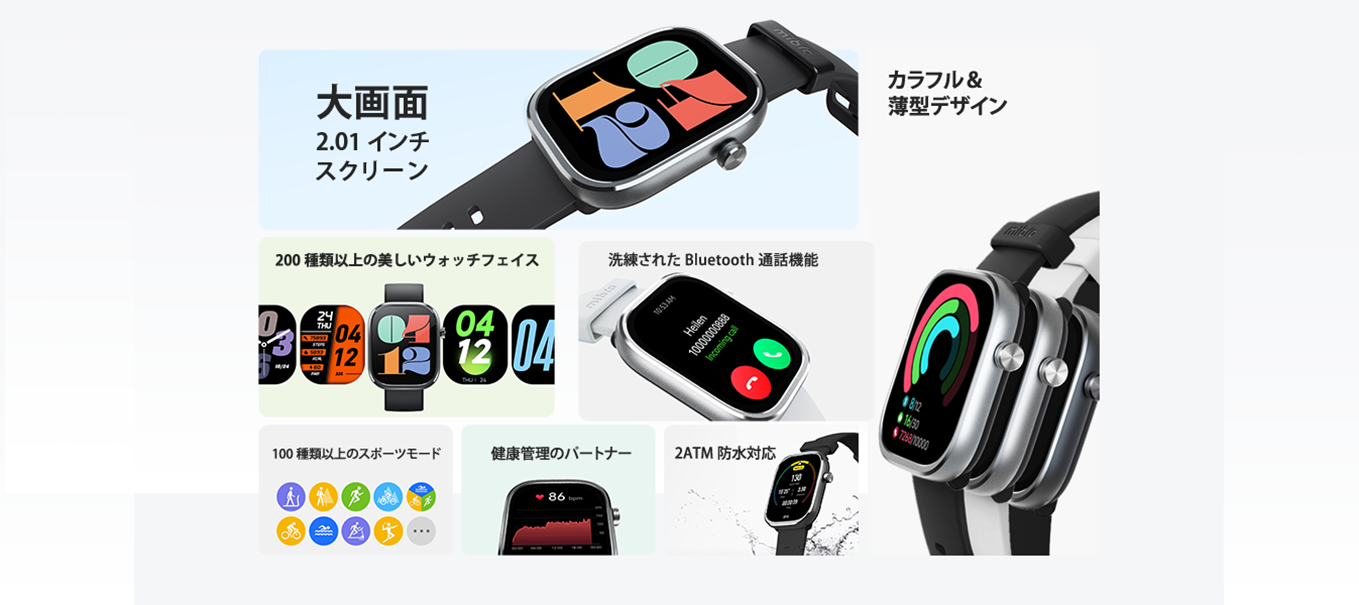 大画面 2.01″ スマートウォッチ|Bluetooth通話対応、100種類以上のスポーツモードを搭載した多機能スマートウォッチ。10日間の標準使用バッテリーと2ATM防水で、日常使いをスマートにサポート。