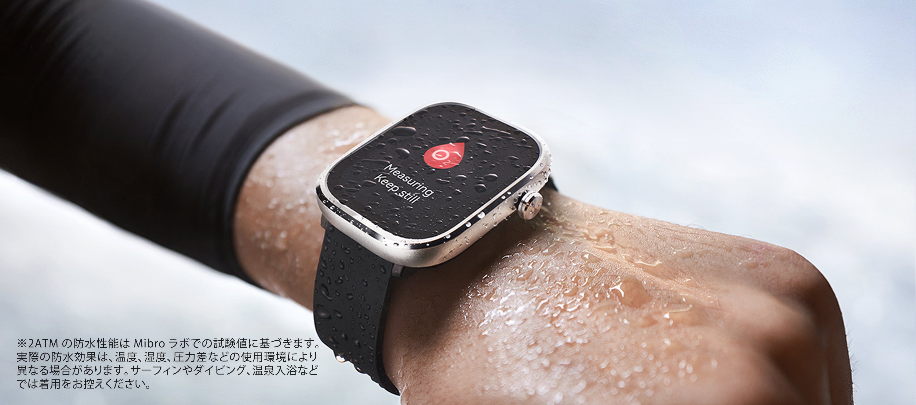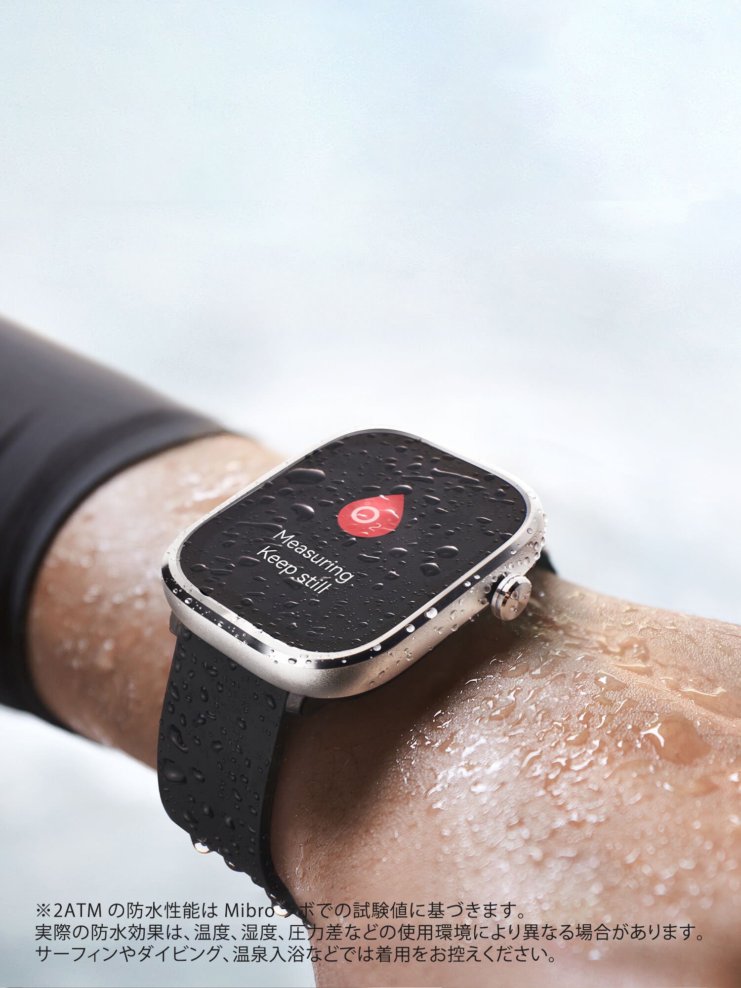 ※2ATMの防水性能はMibroラボでのテスト値です。実際の防水効果は使用環境(例えば、温度、湿度、圧力差)により異なる場合があります。サーフィンやダイビング、温泉に浸かる際には着用を避けてください。