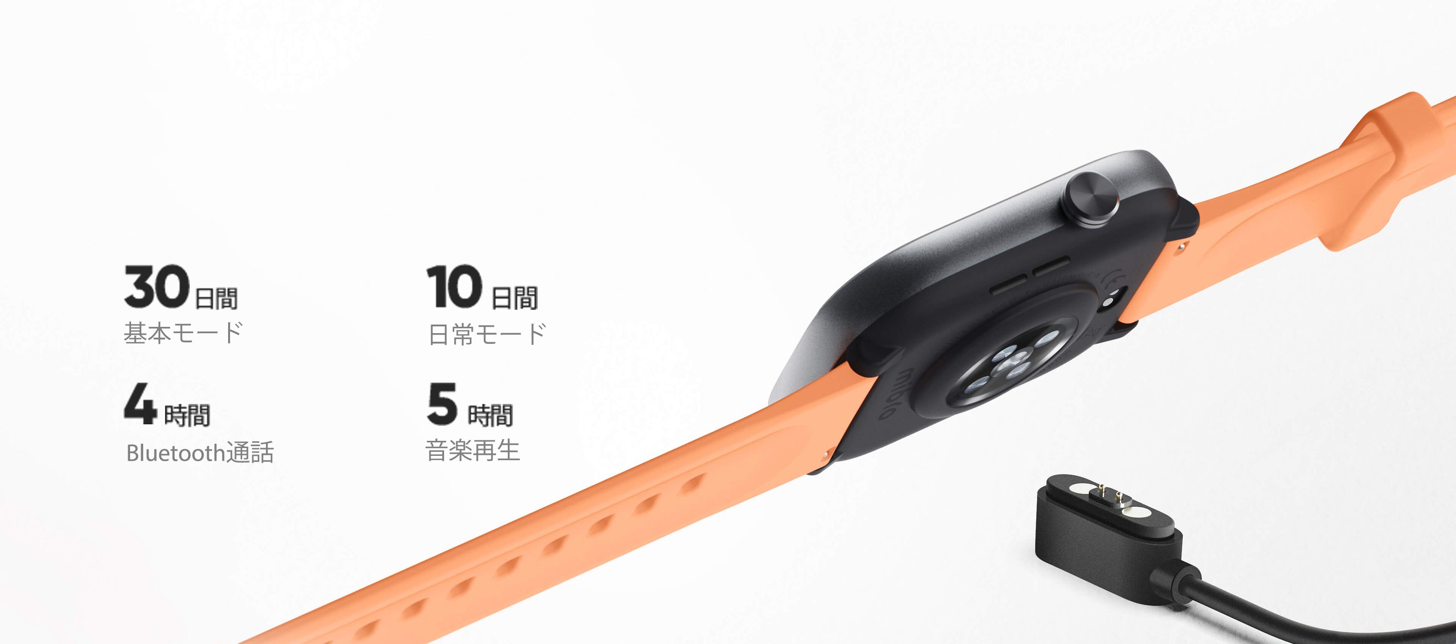 1回のフル充電で通常利用なら最大10日間バッテリーが持続。こまめな充電のストレスからも解放されます。2ATMの防水性能を備え、日常生活での汗や洗顔のときの水滴、雨などに耐えられます。※防水性能はMibroのテストに基づいています。実際の防水効果は温度、湿度、圧力差などの異なる環境によって変わる可能性があります。サーフィン、ダイビング、温泉などのアクティビティでの着用はお控えください。