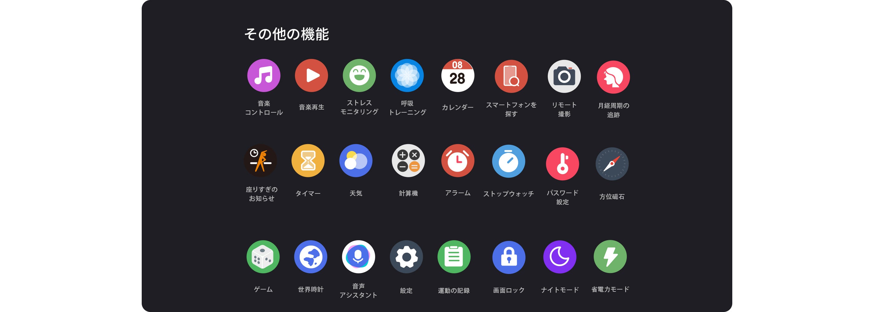 様々なアプリ通知に対応しているため、LINEやメール、インスタグラムなどのお知らせも見逃しません。デスクワークに役立つ座りがちリマインダー、水分補給通知機能も搭載していて、日々の生活を健康的に過ごすことができます。