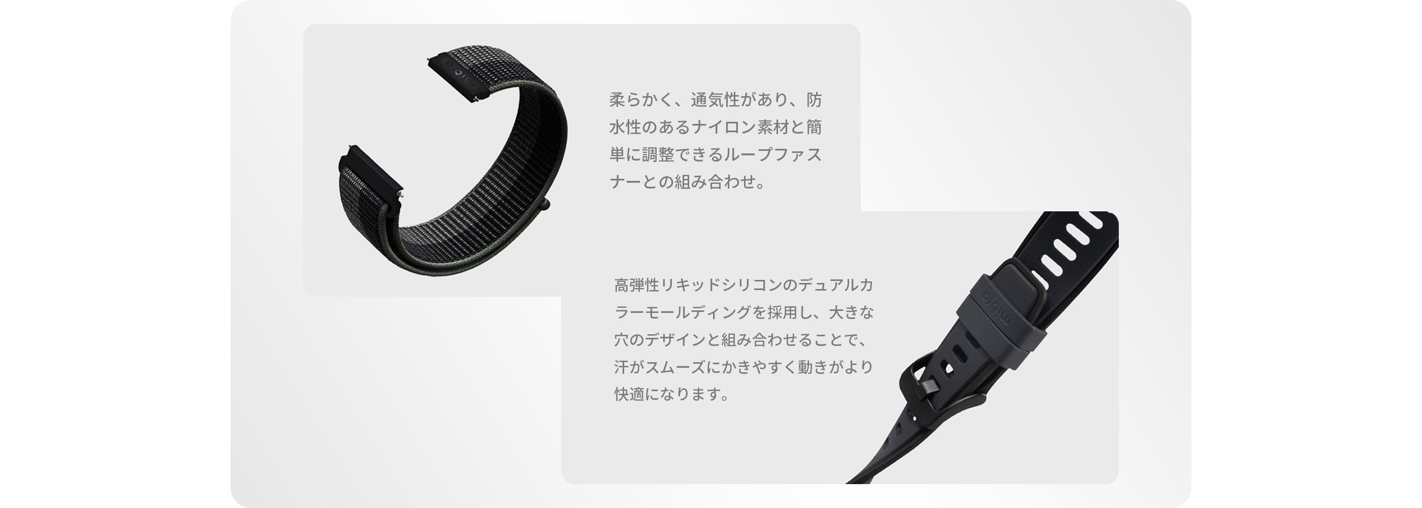 通気性の良いナイロン、汚れても簡単に拭けるシリコンの2種類のバンドが初めから付属しています。