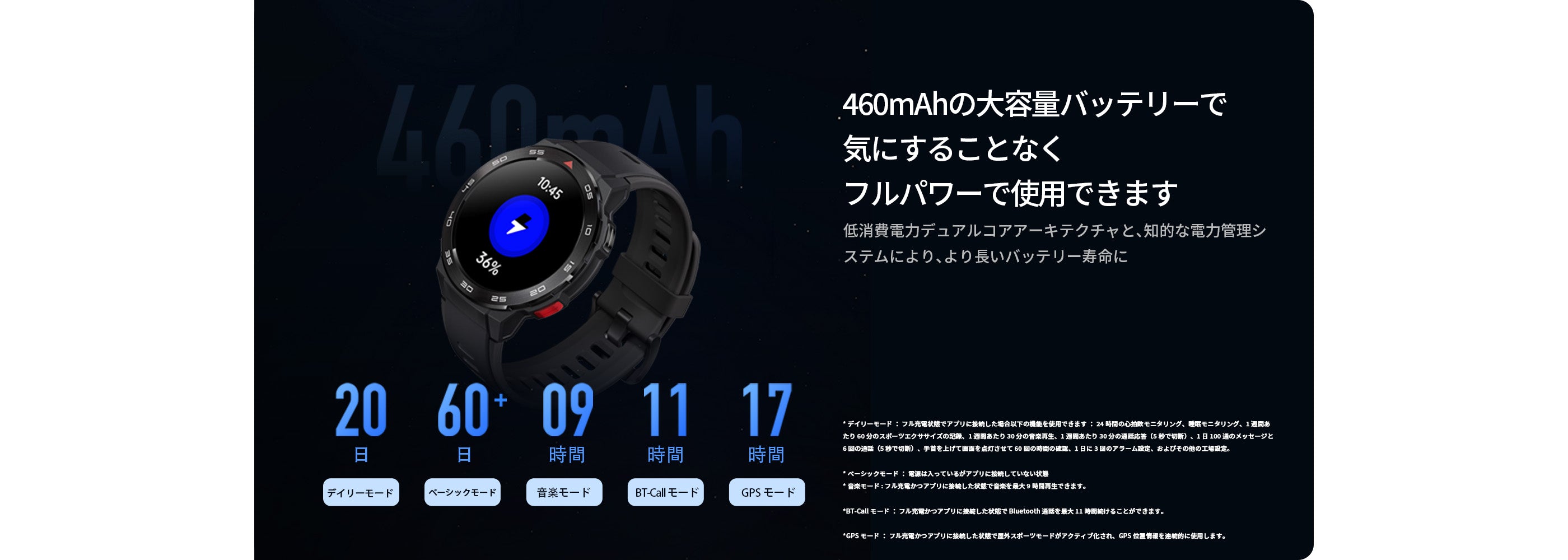 460mAhの大容量バッテリーにより、デイリーモードで最大20日間の電池持ちを実現!長期間の旅行や出張中に、万が一充電器を紛失してしまってもすぐに焦る必要がありません。