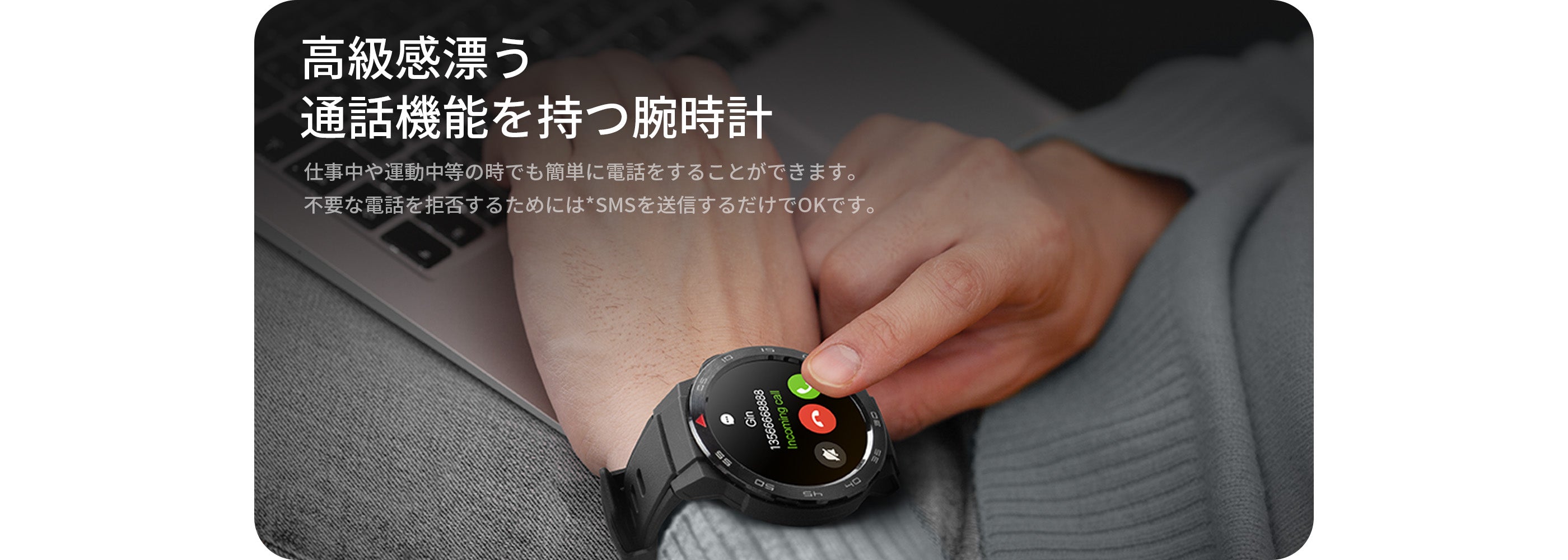 仕事中や運動中でもウォッチから簡単に電話の発着信ができます。Android6.0を搭載のスマホであれば、電話に出られない時にワンクリックでSMS返信も可能です。