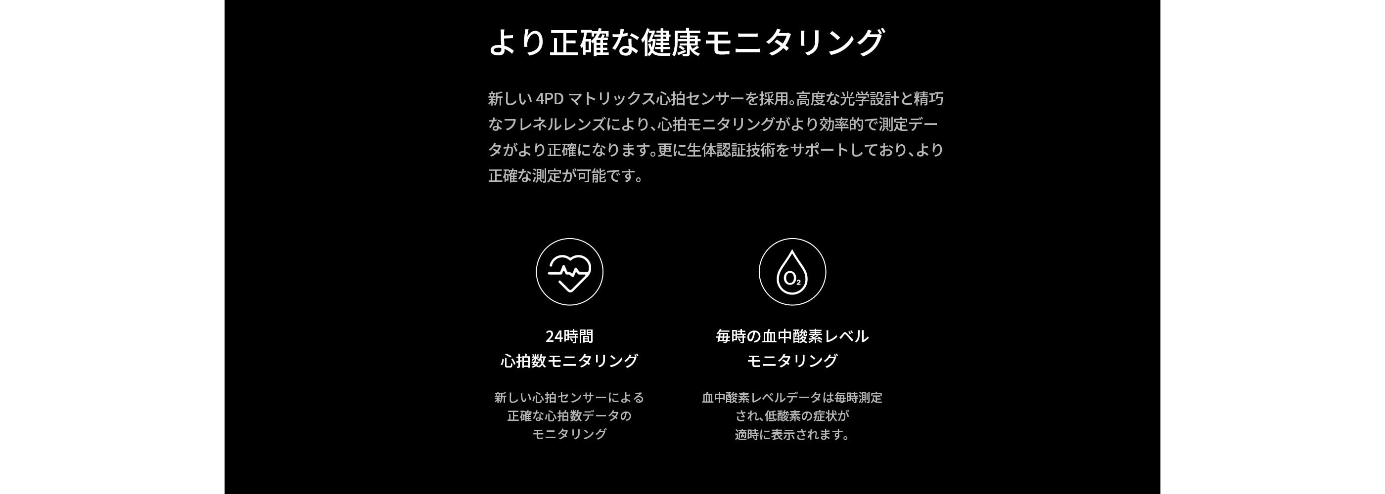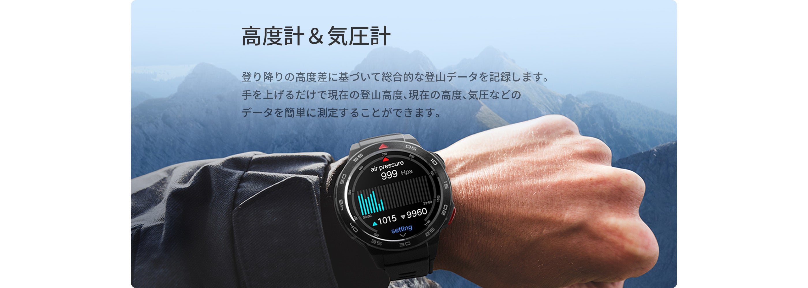 精度の高いGPSを搭載しているため、スマホなしでも運動したルートが記録できます。身軽にランニングしたいときなどに役立ちます!さらに気圧高度計と血中濃度レベル測定のおかげで、登山中の急激な体調変化などの危険を予め回避することができます。