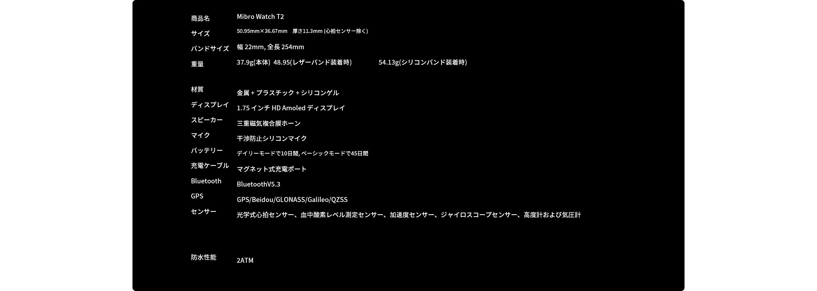 ■センサー:光学式心拍センサー、血中酸素レベル測定センサー、加速度センサー、ジャイロスコープセンサー、気圧高度計