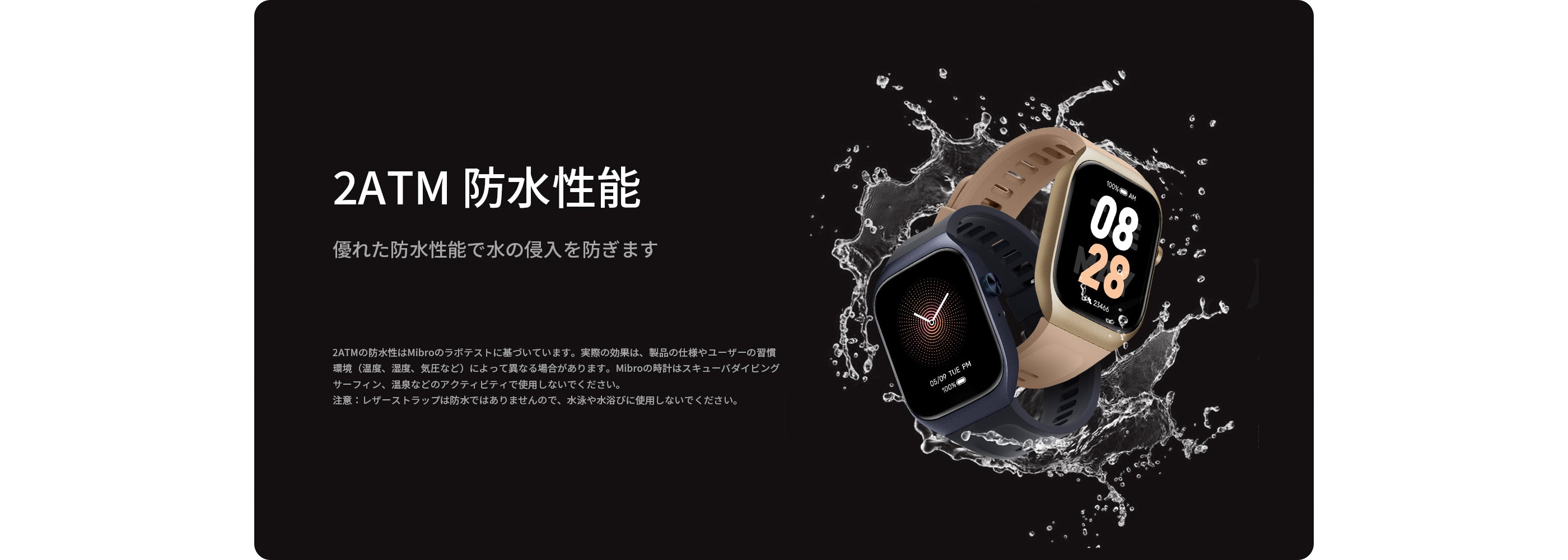※防水性能はMibroのテストに基づいており、特定の製品、ユーザーの習慣・環境(温度・湿度・気圧など)によっても異なります。