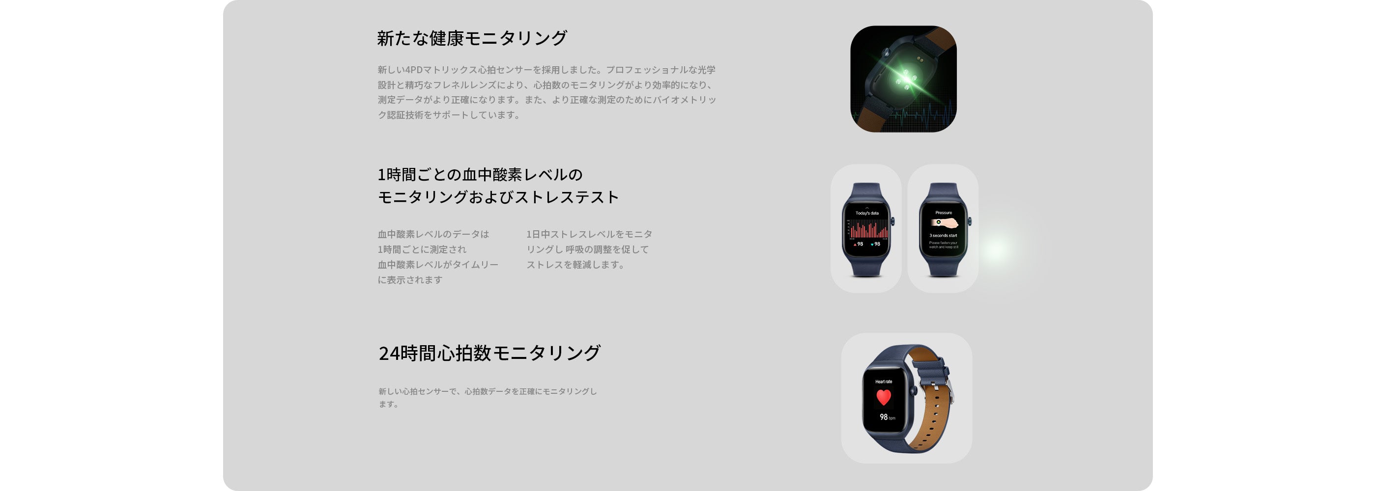 ※本製品およびMibro Fitアプリは日常的な運動・健康管理のための製品であり、医療機器ではありません。本製品のデータは医療行為または精度を要する業務・専門的な計測には使用いただけません。センサー領域が入れ墨、着色、または濃い色調の皮膚に接触すると、データの精度に影響があります。
