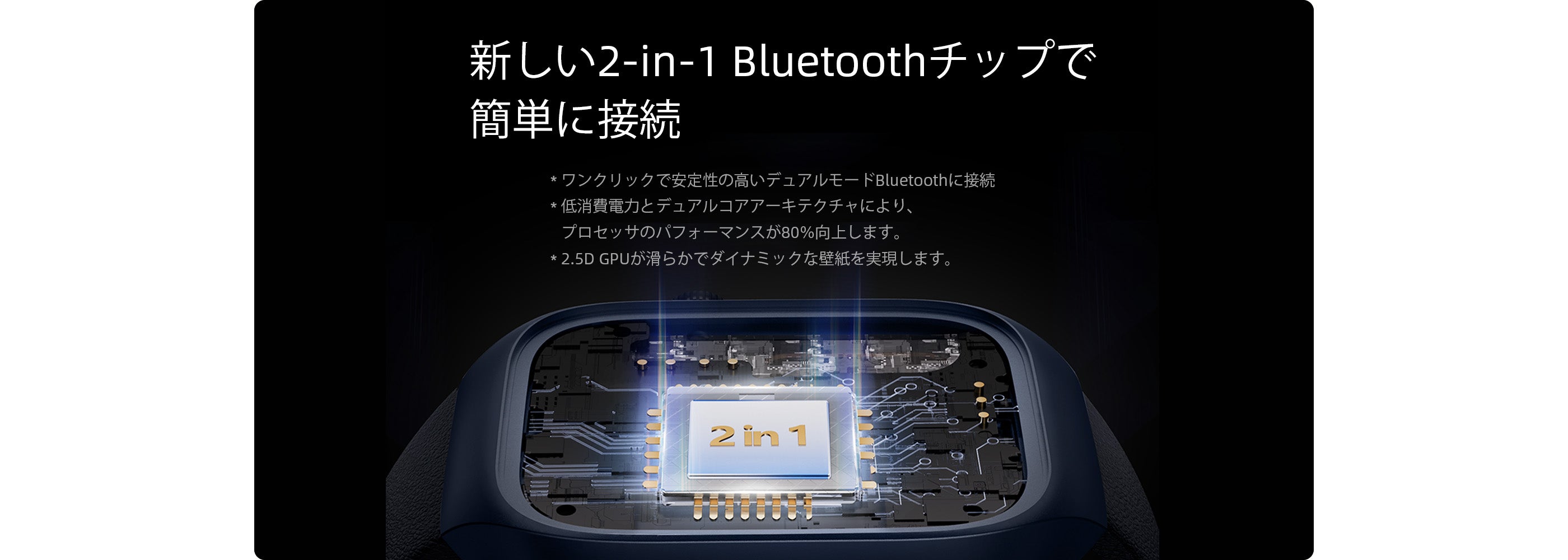 高性能 × 省電力を両立する次世代プロセッサー。Mibro T2 には、先進の「デュアルコア 2-in-1 チップ」を搭載。高性能コアと低消費電力コアを1つに融合したこの革新的な設計により、次のようなメリットを実現しました。