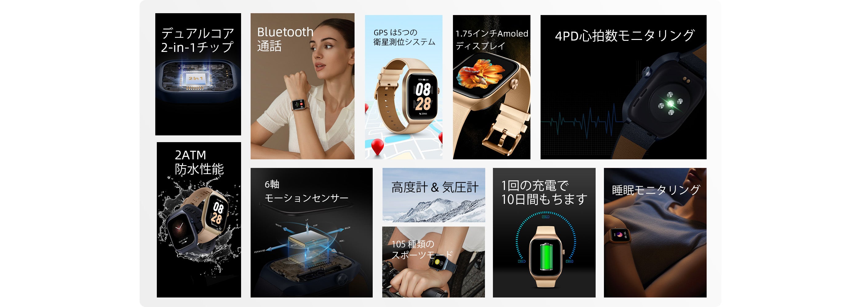 1.75インチ AMOLED ディスプレイ、5衛星測位対応、Bluetooth 通話対応、10日間バッテリー、105種類スポーツモード、4PD 心拍モニタリング、2ATM 防水など多機能を備えたスマートウォッチ。日常から運動・活動記録まで幅広くサポートします。