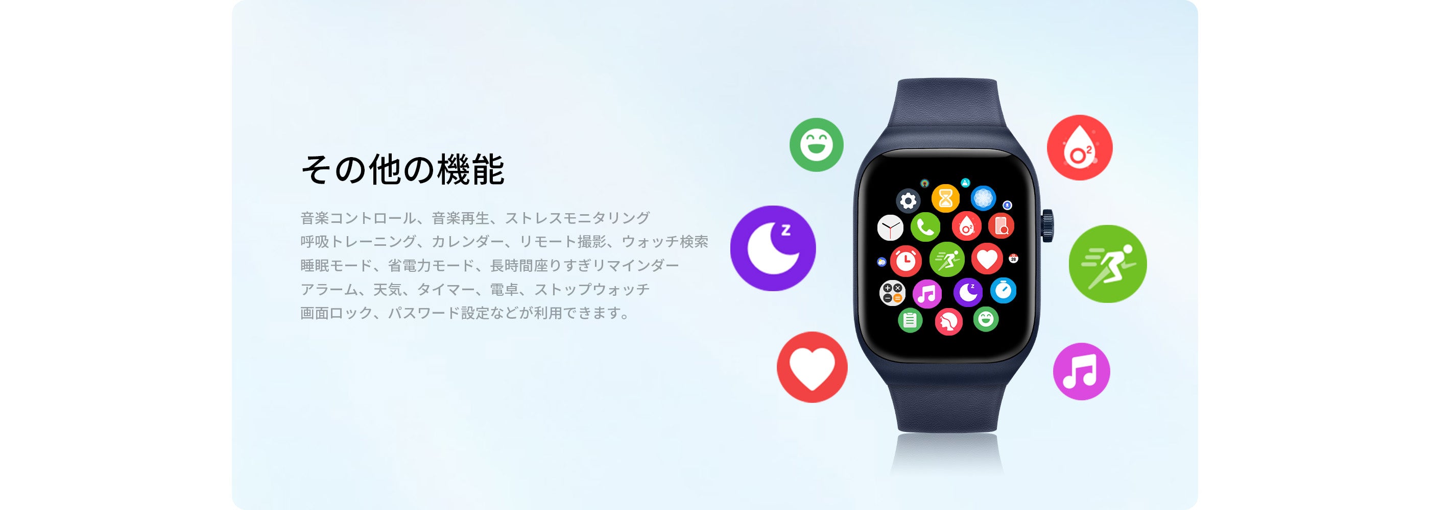 105種類以上のプロフェッショナルなスポーツモードを搭載し、毎日24時間、あなたの健康(血中酸素レベル、心拍数、ストレスレベル)をリアルタイムで見守ります。スマートに睡眠を解析し、快適な眠りをサポート。SMS、天気予報、アラームなど、毎日をもっとスマートにする機能が満載。(※測定データはあくまで参考値です。医療診断や治療の目的には使用しないでください。)
